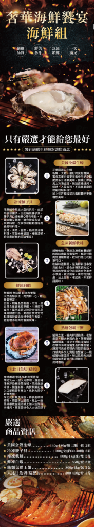 頂級奢華海鮮組(含生蠔、霸王蟹、大比目魚等),體驗價值超過5000元